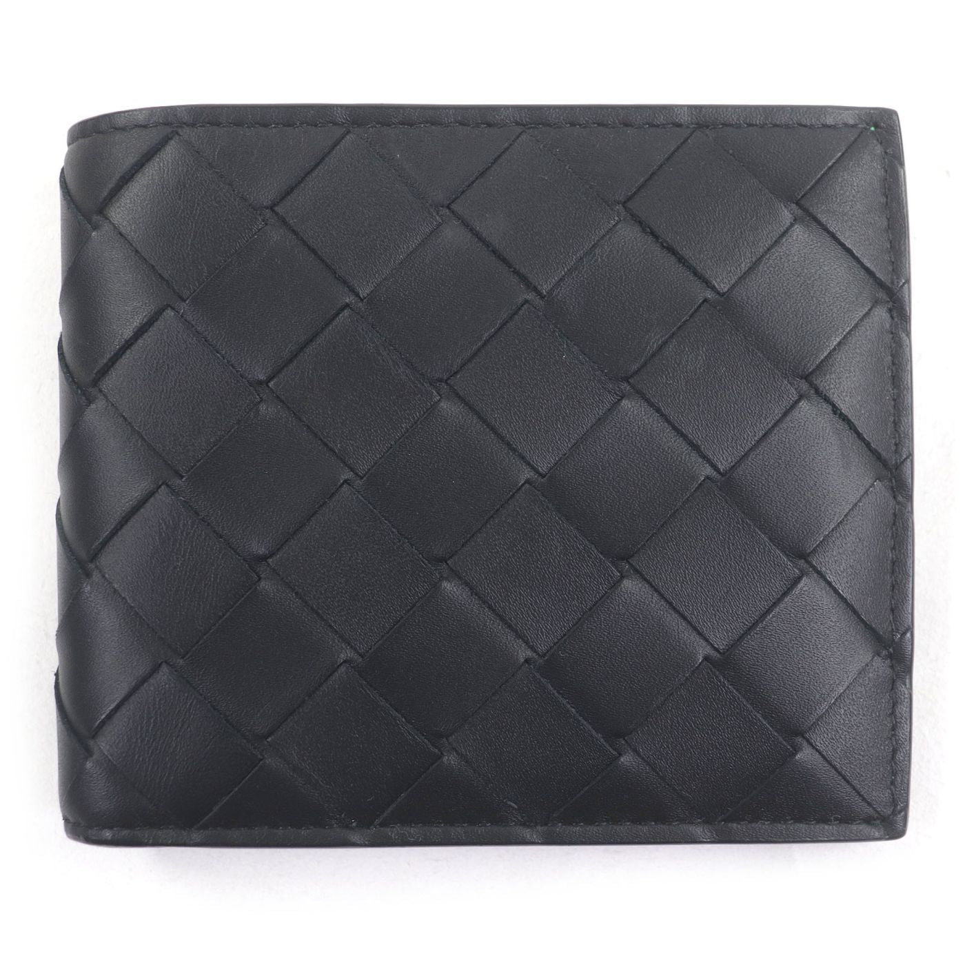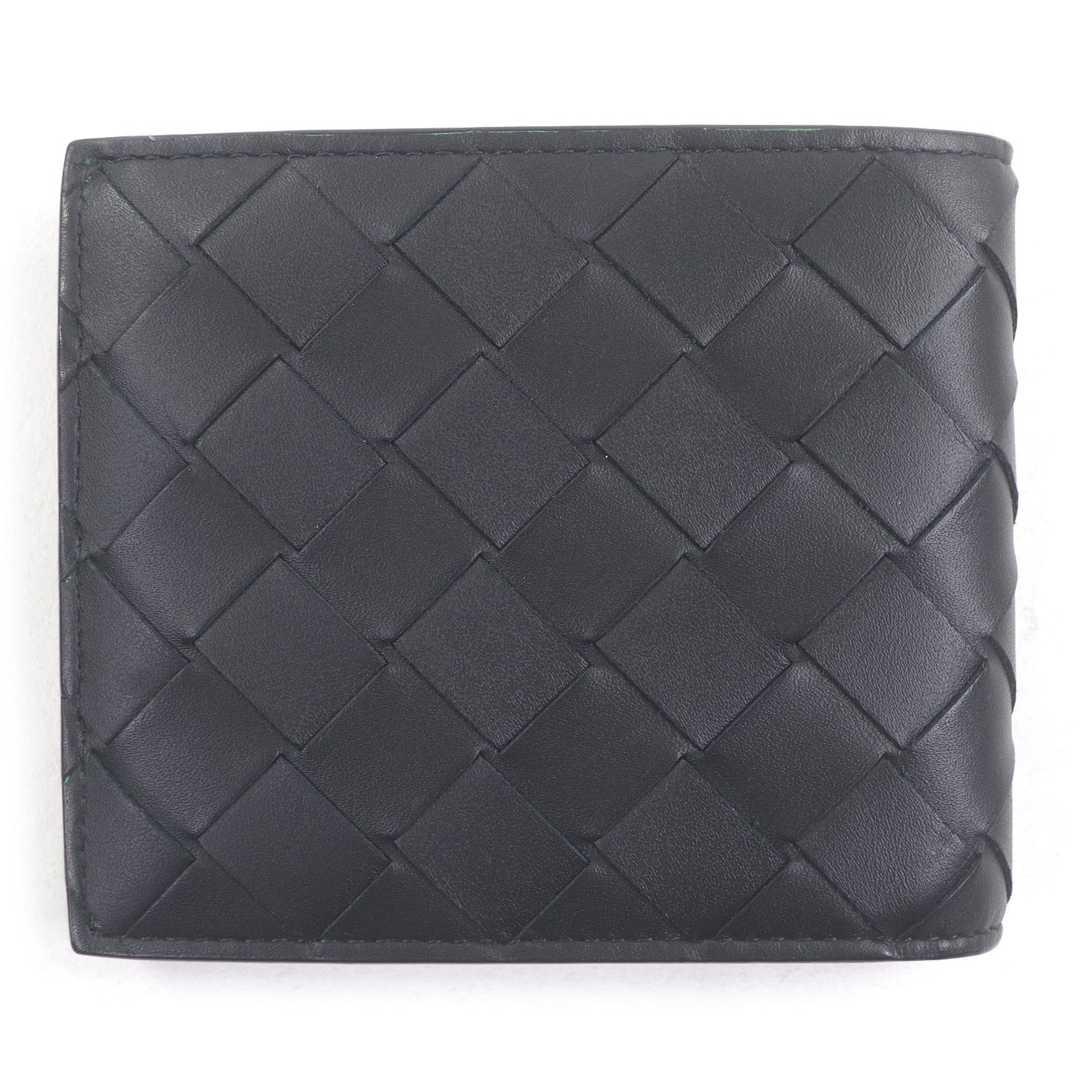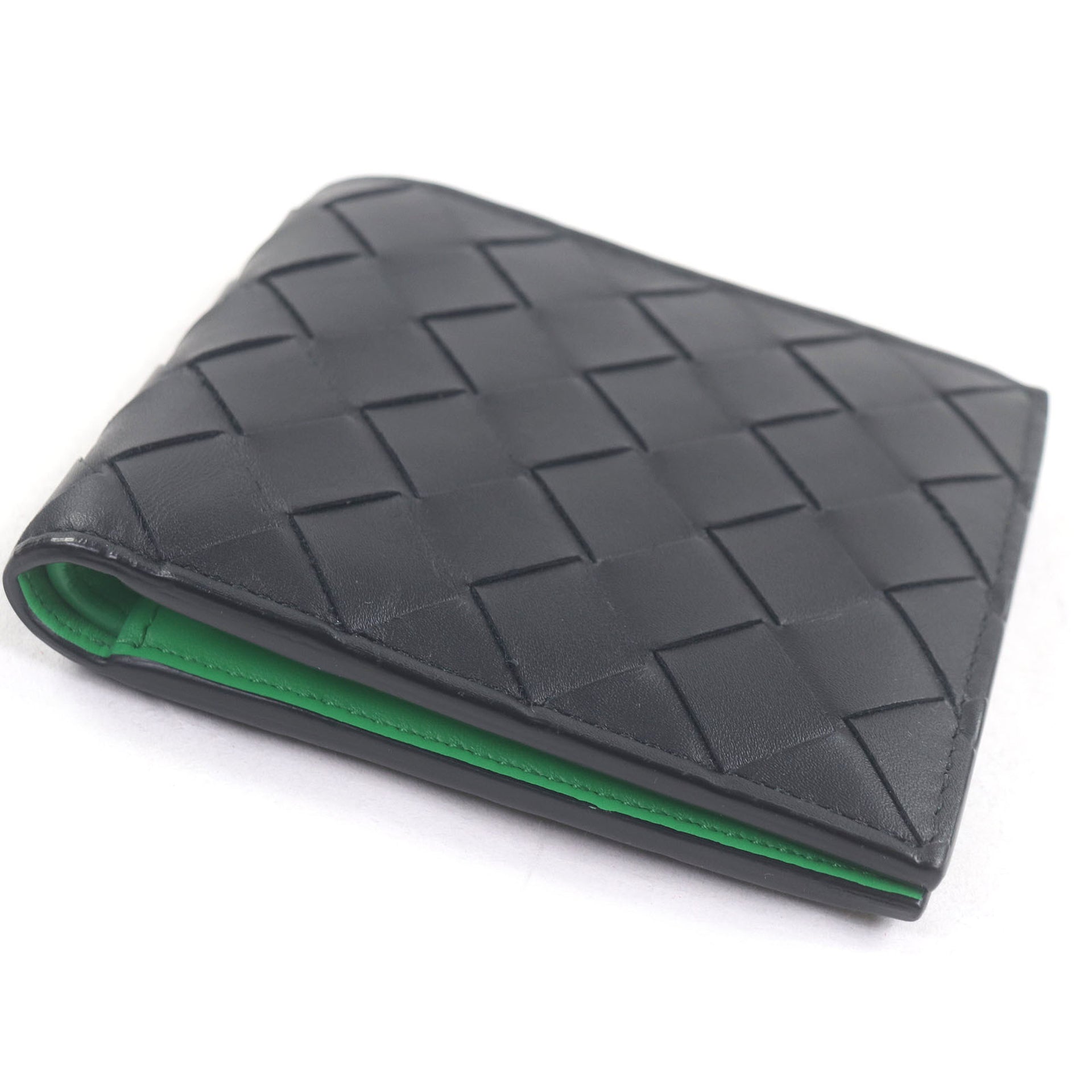 BOTTEGA VENETA 743211 Leather Intrecciato Compact Bi-fold Wallet, Black/Green, with Dust Bag, Made in Italy, Men\'s