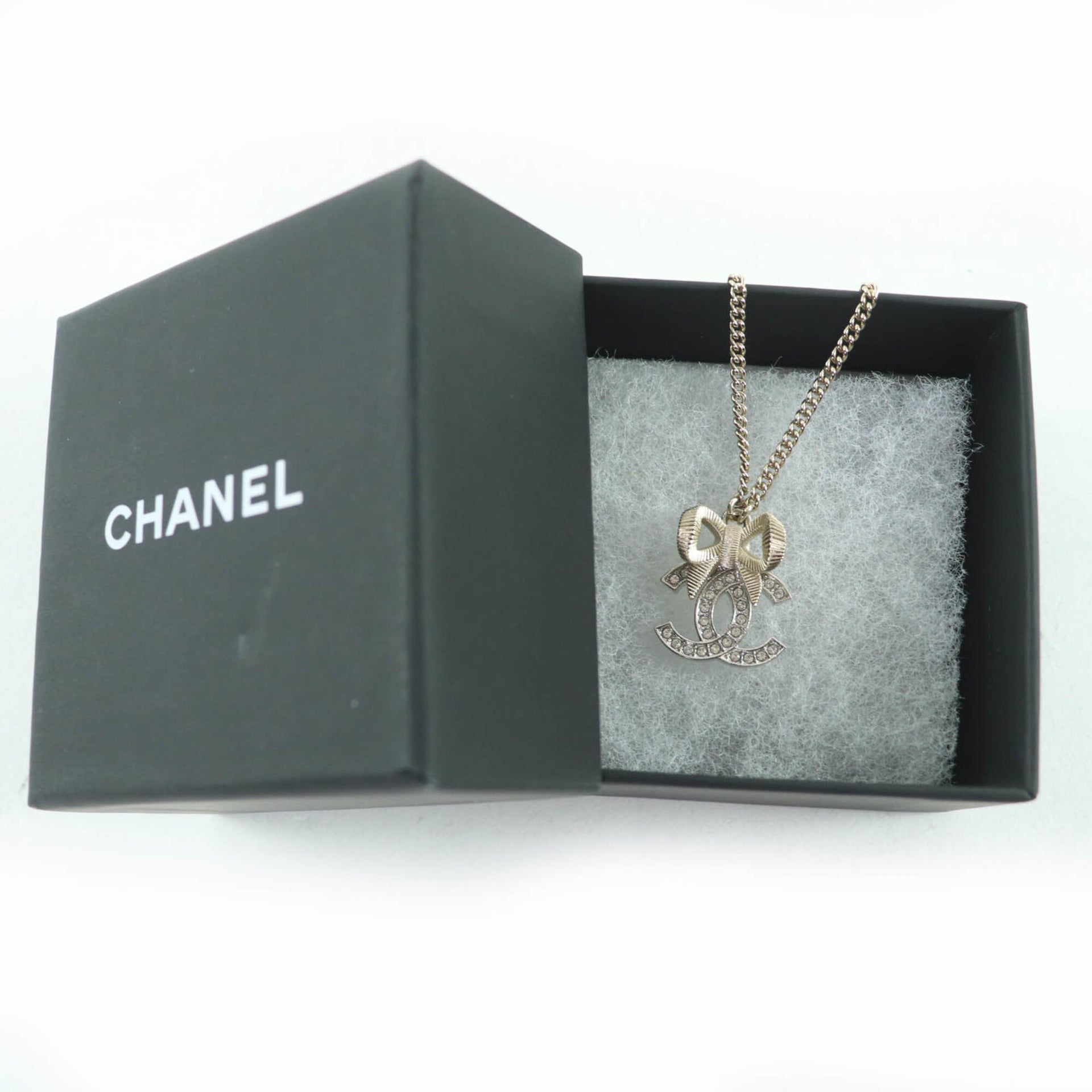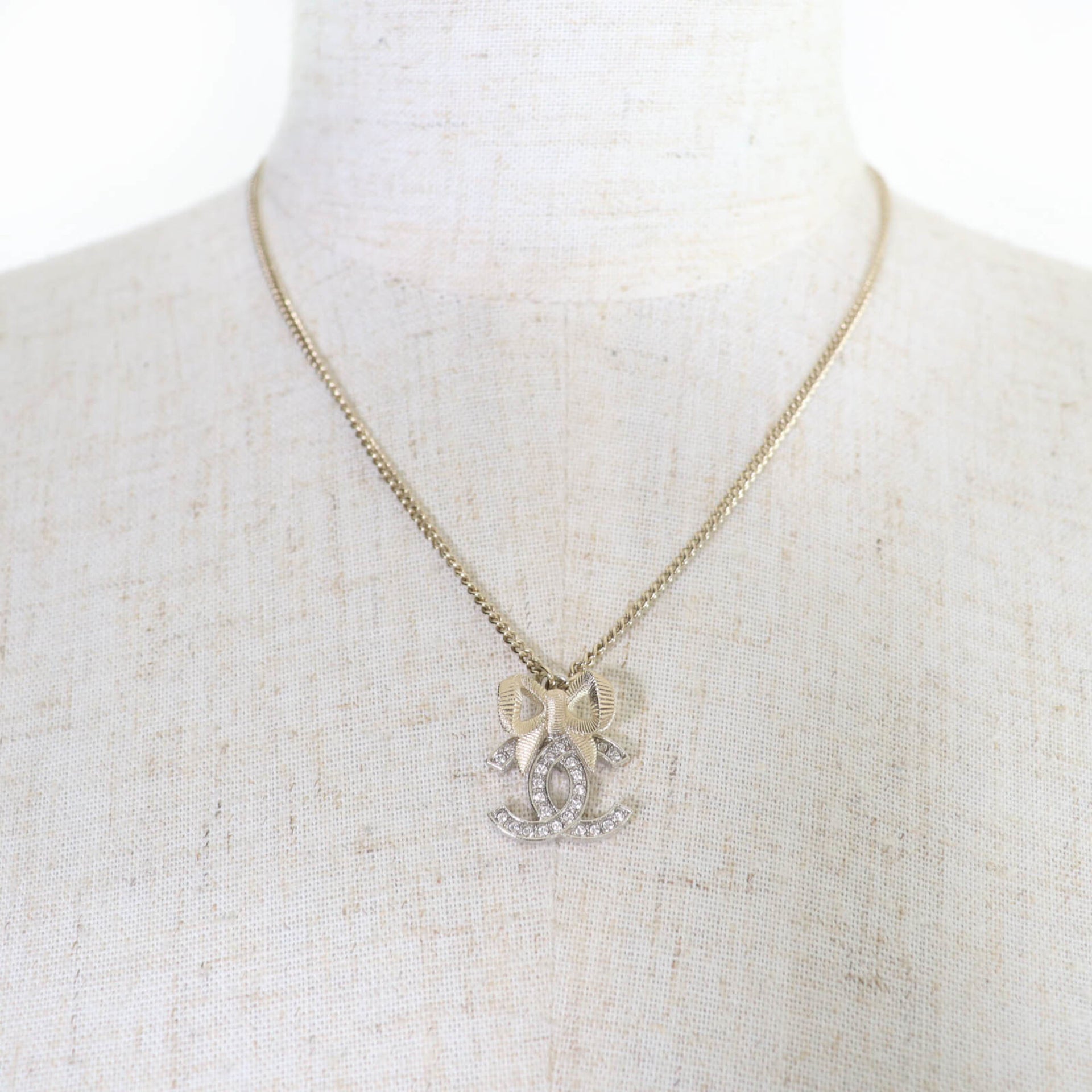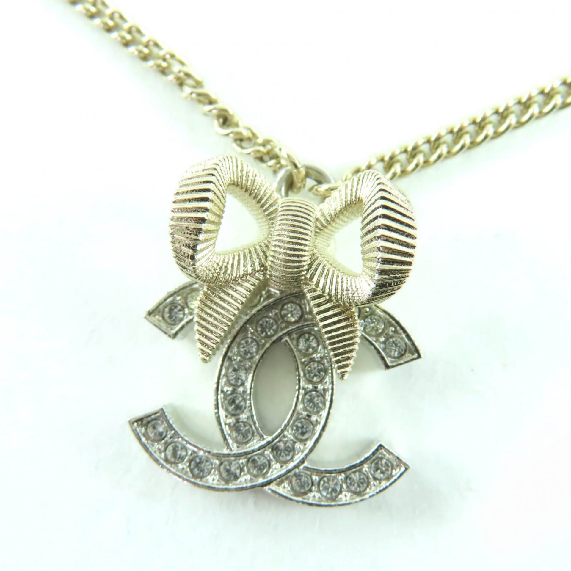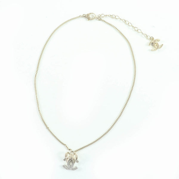 CHANEL B24K Coco Mark Ribbon Rhinestone Necklace, Champagne Gold, with Box, Made in Italy, Women\'s