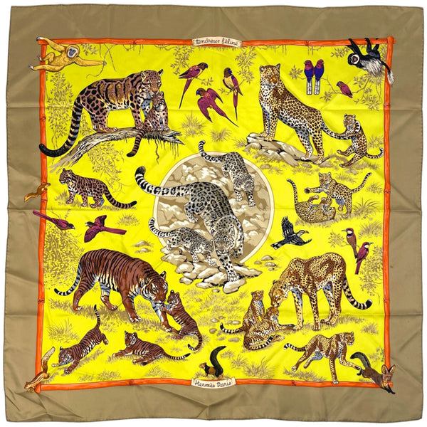 Hermes Carre 90 Tendresse Feline \"Wild Gentleness\" Silk Scarf/Muffler in Brown and Yellow Multicolor for Women