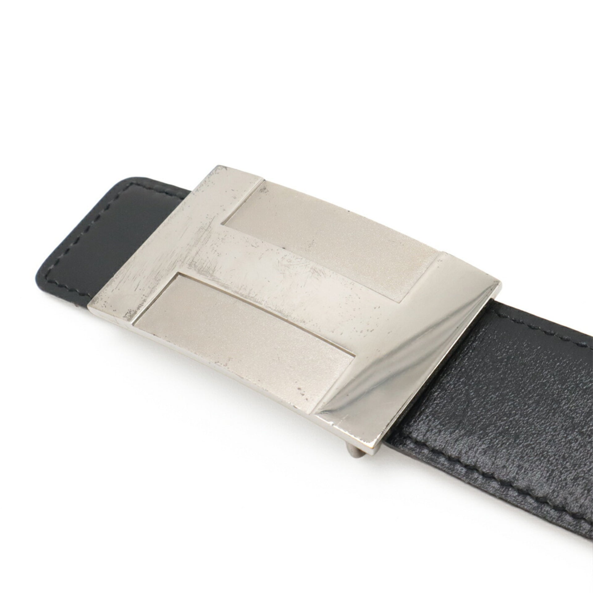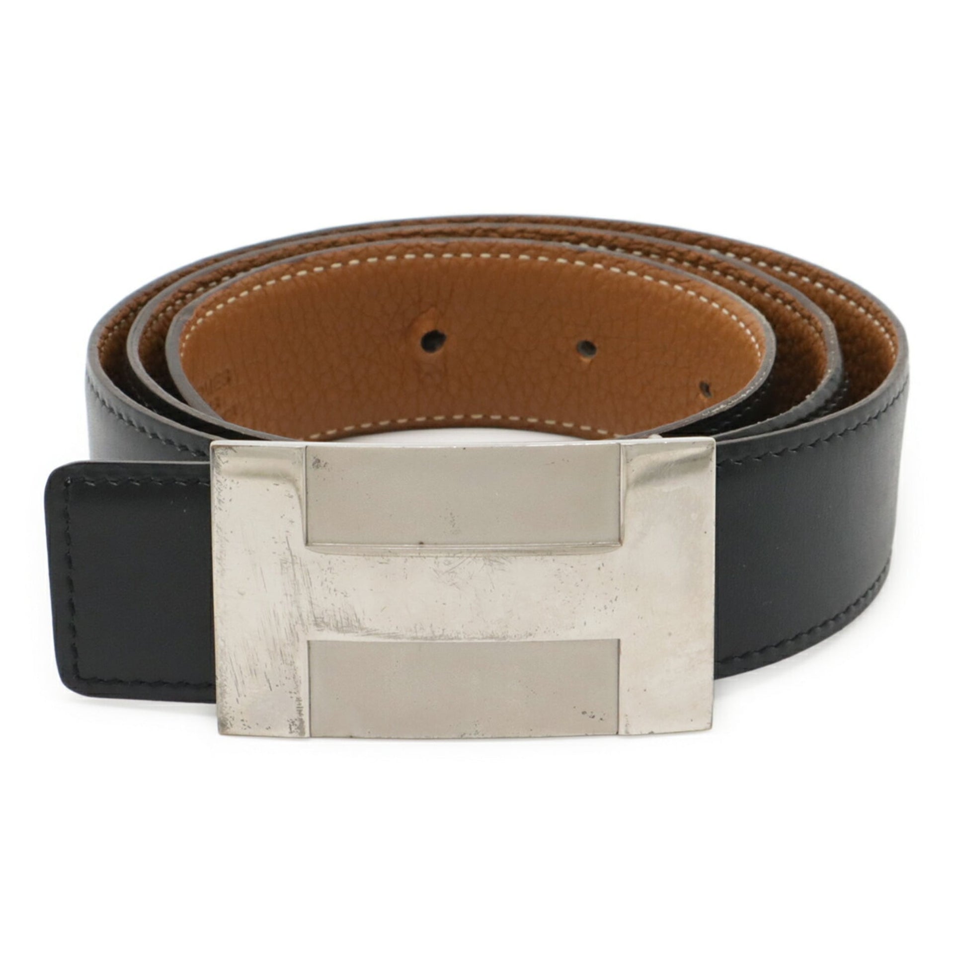 HERMES H-Plate Belt, Reversible, Box Calf Togo Leather, Black, Brown, #80, Engraved with L
