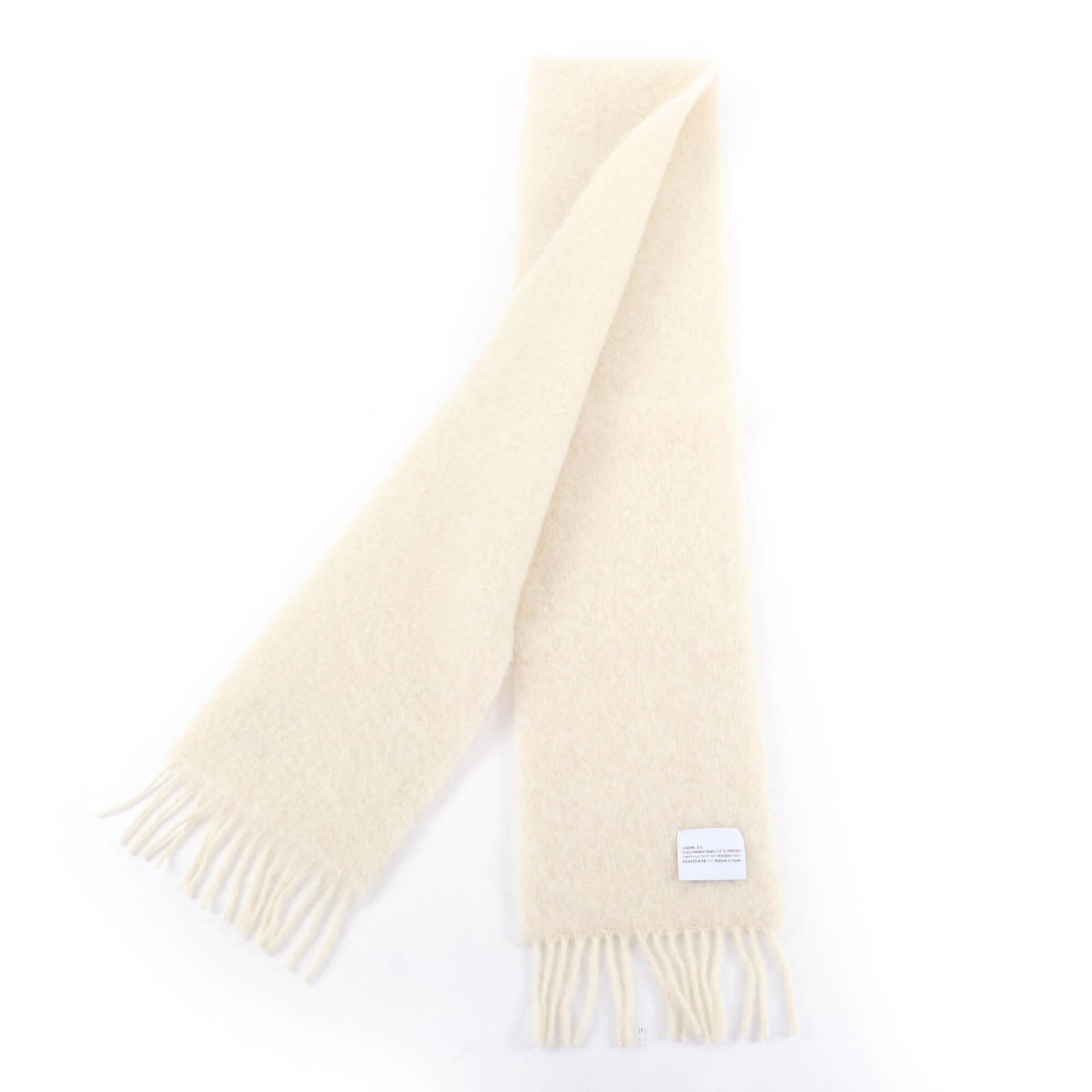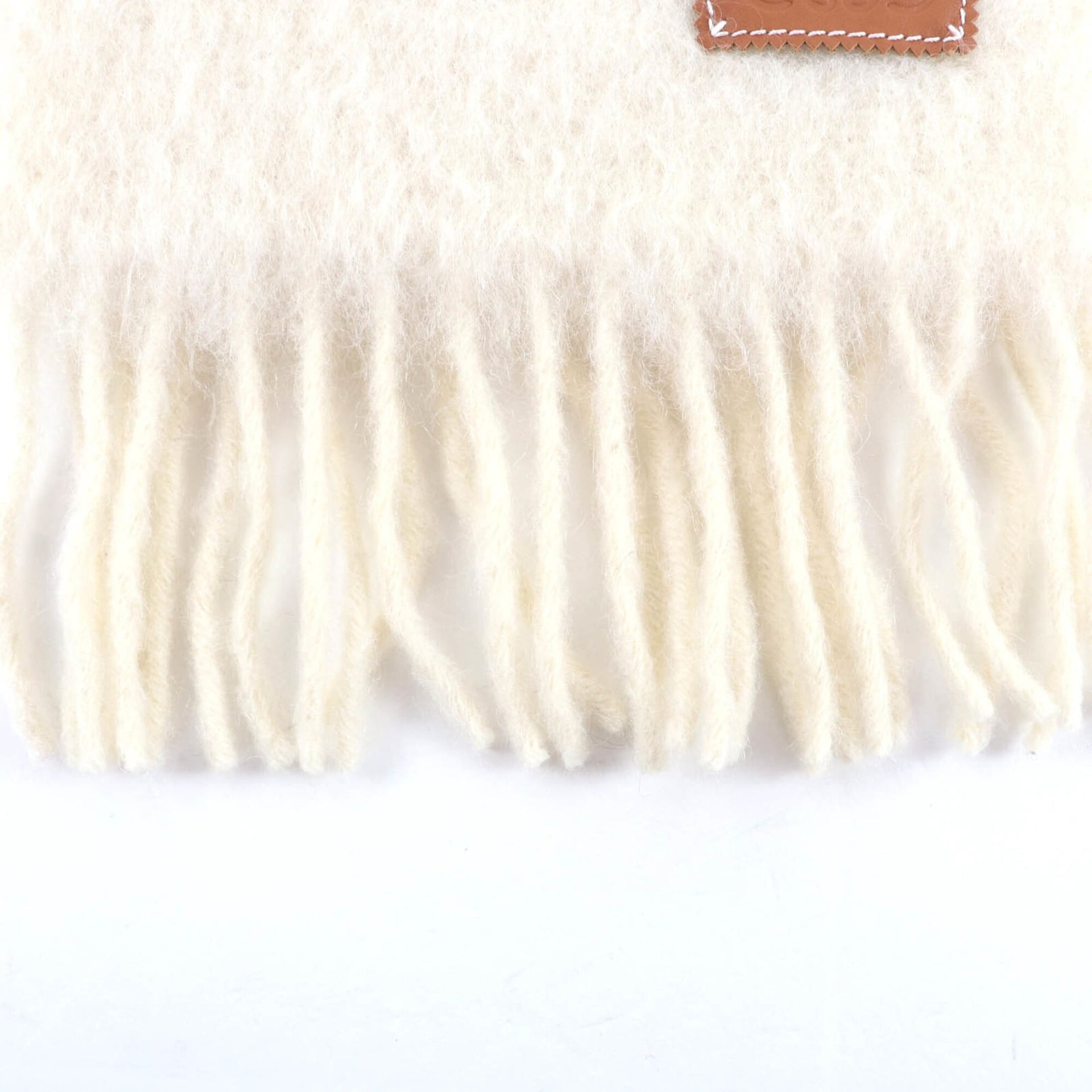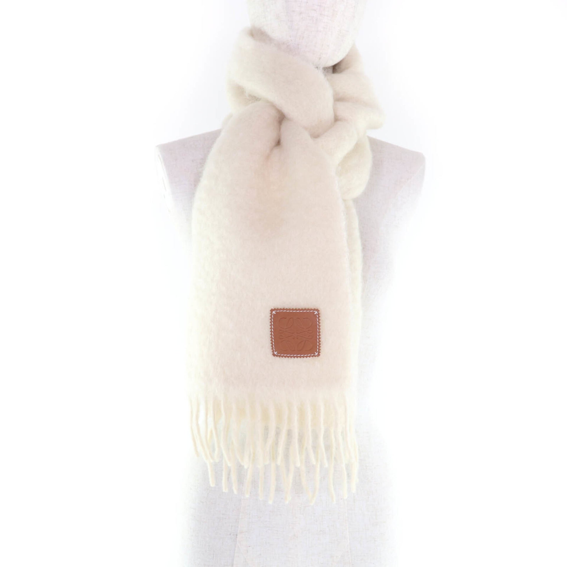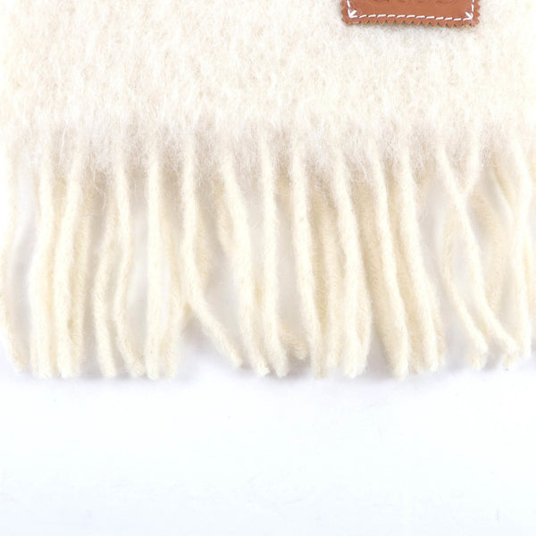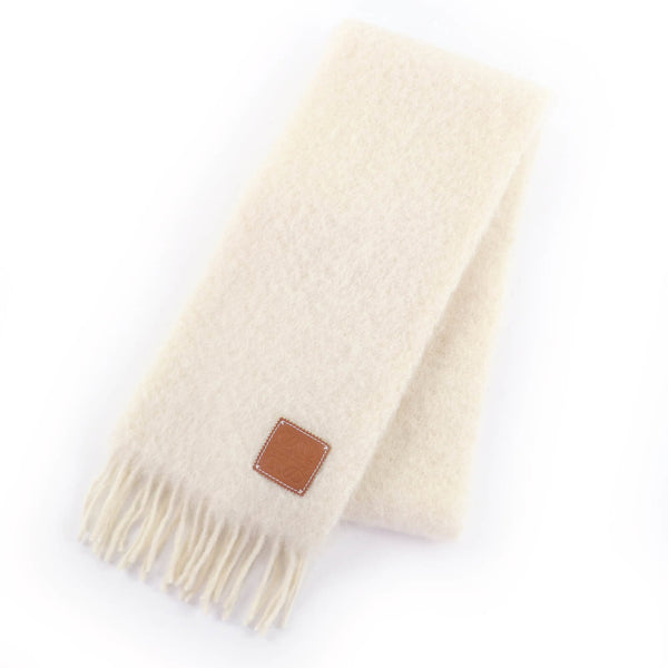 LOEWE A-28003861 Mohair and Wool Blend Scarf with Leather Anagram Patch Fringe, Ivory, Made in Spain, Authentic, Women\'s