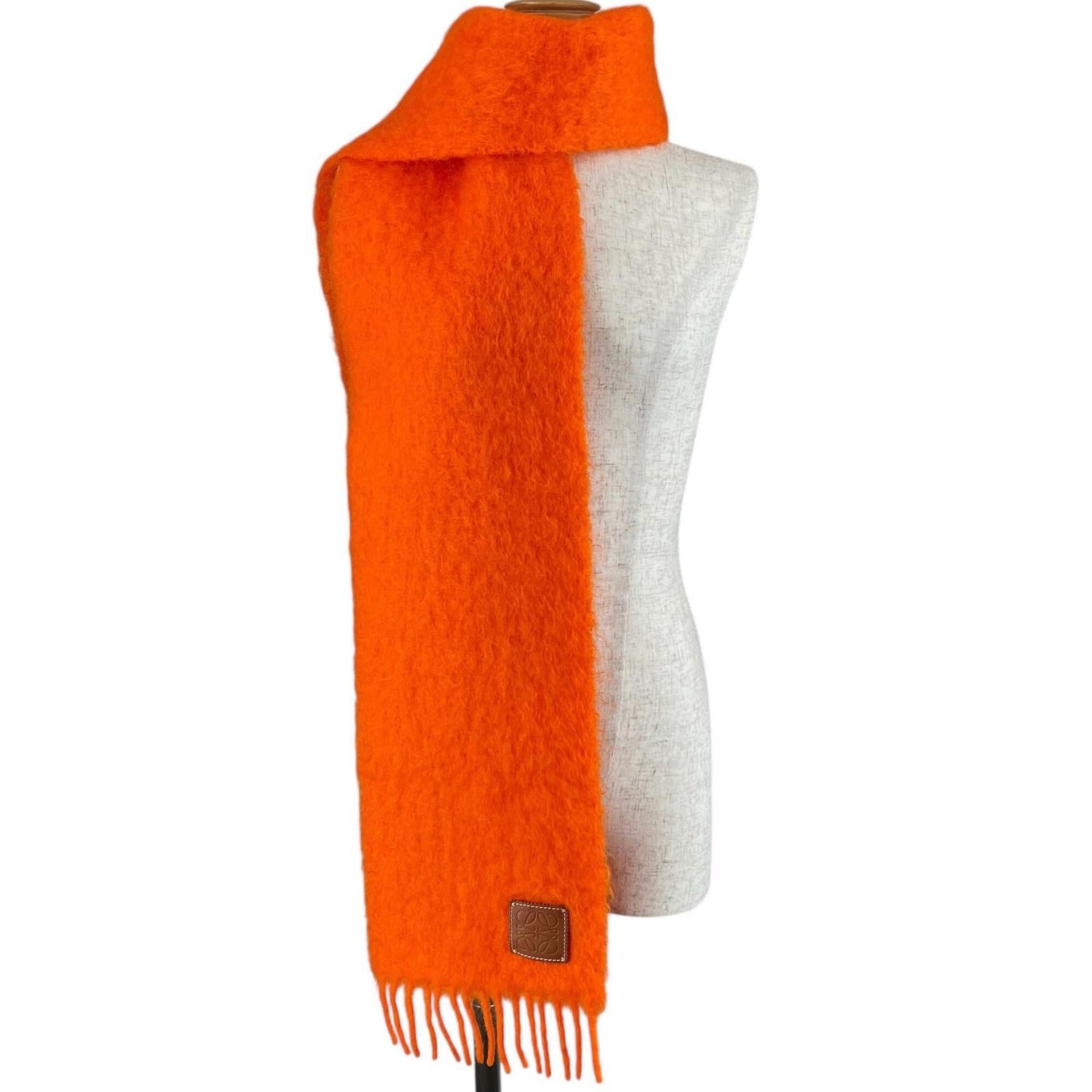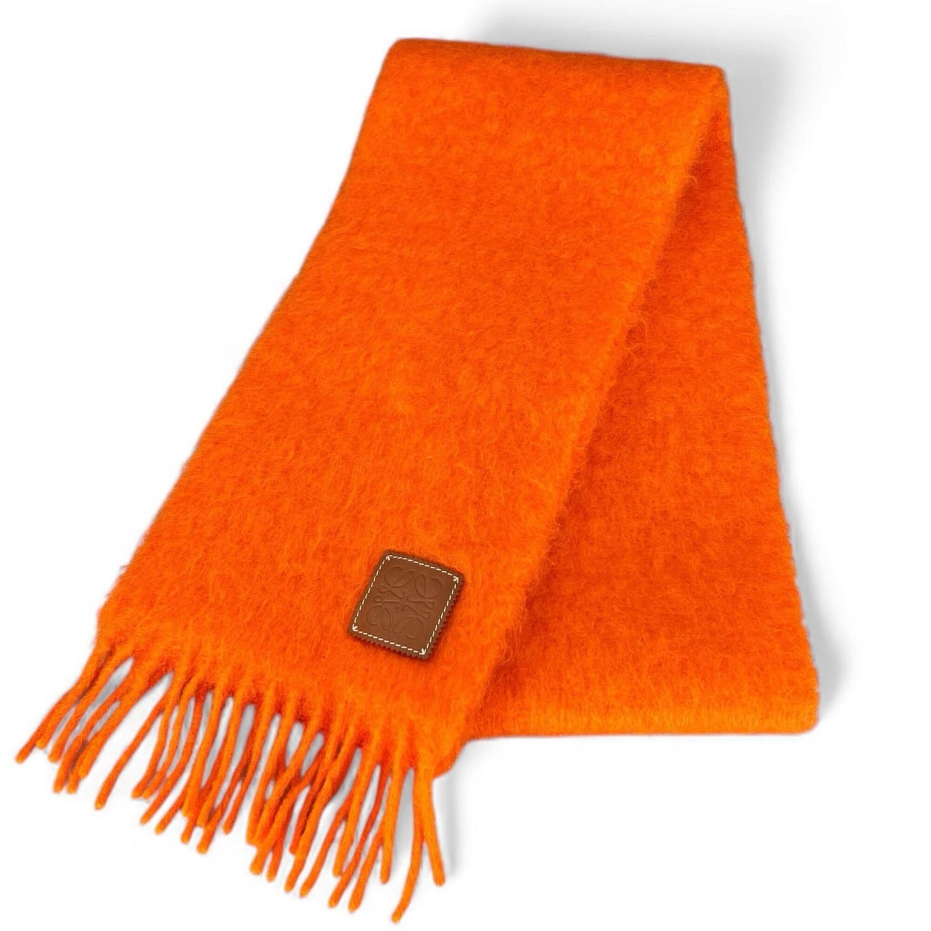 LOEWE Mohair Wool Anagram Leather Patch Fringe Scarf, Orange, Made in Spain, Authentic, Women\'s