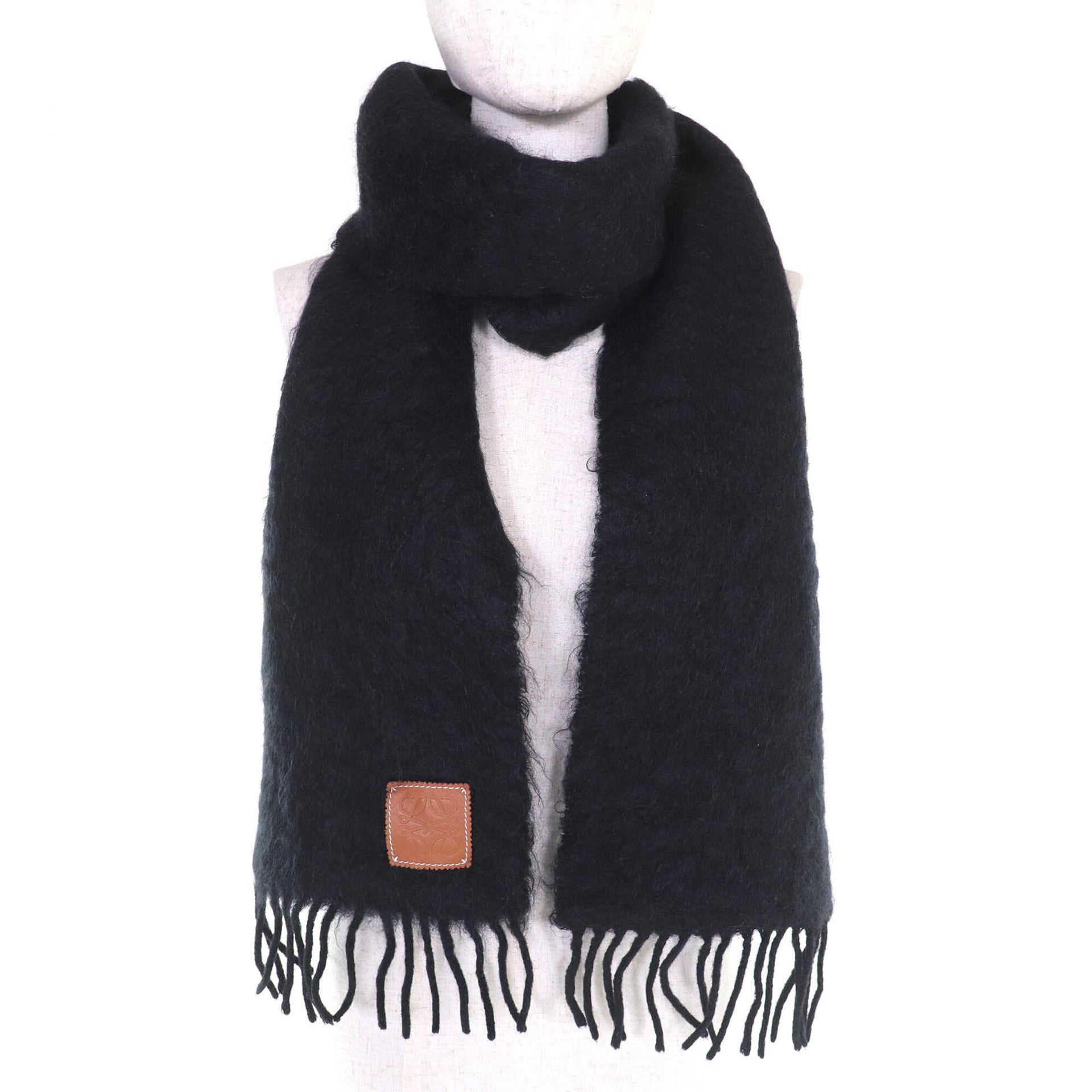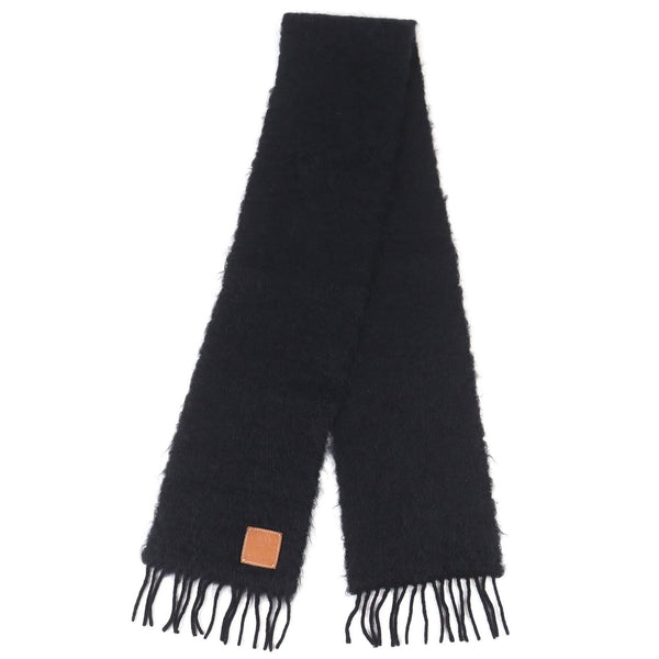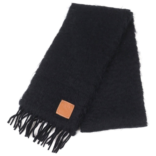 LOEWE Mohair Wool Anagram Logo Patch Fringe Long Scarf, Black, Made in Spain, Authentic, Women\'s