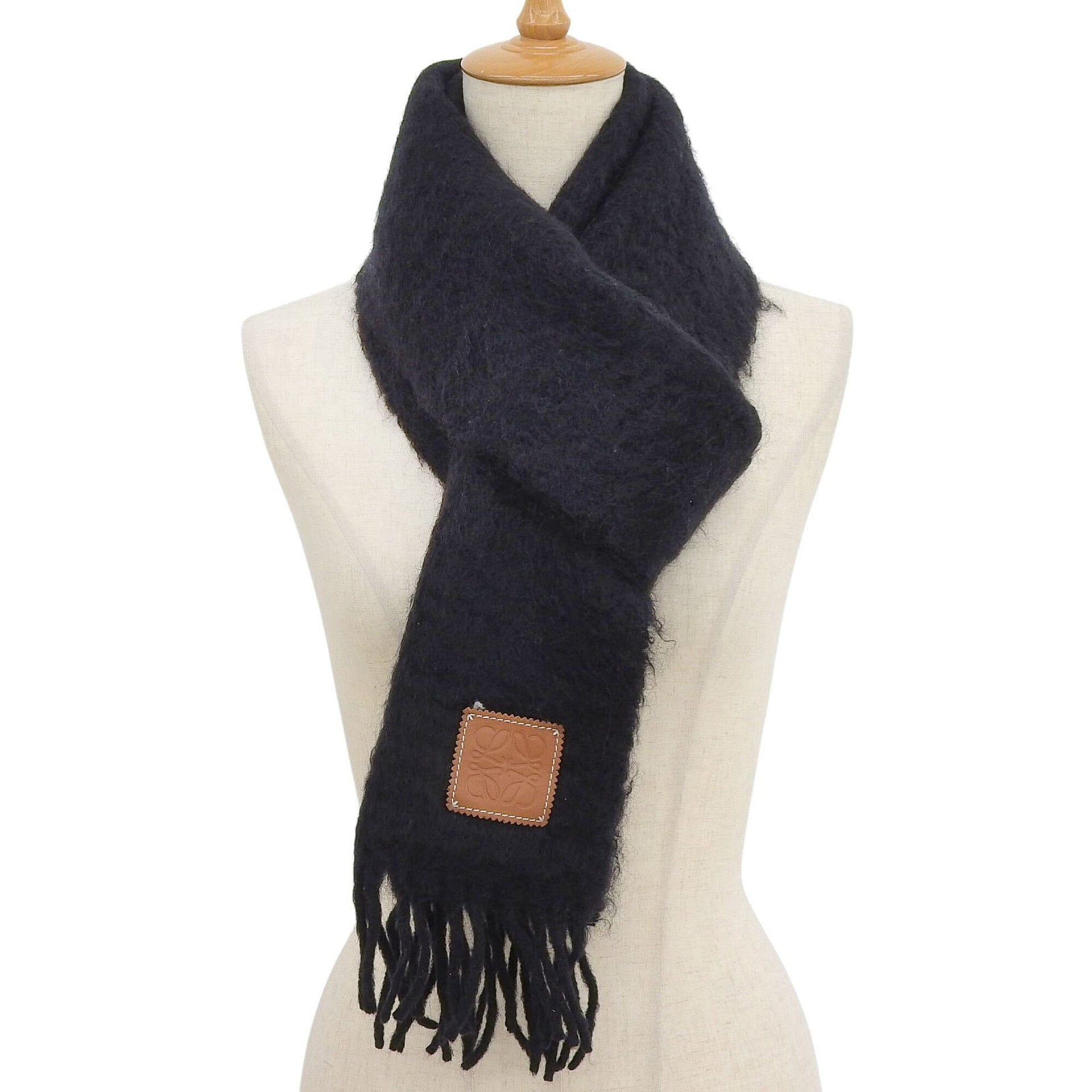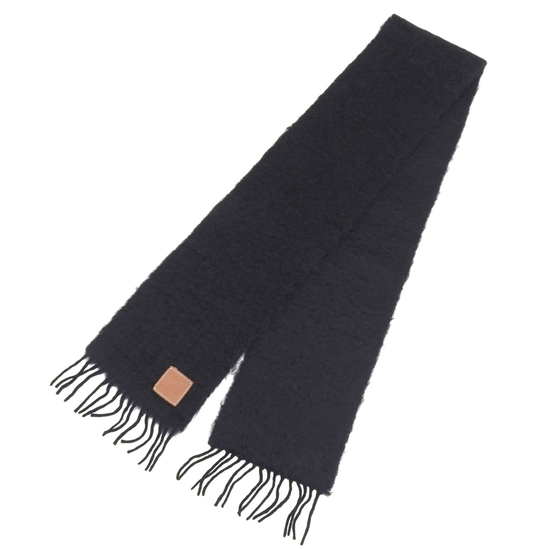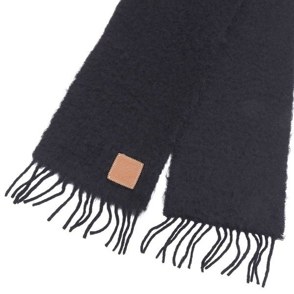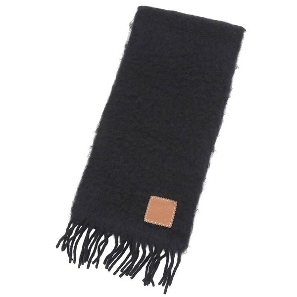 LOEWE Mohair Wool Blend Anagram Leather Patch Fringe Long Scarf, Black, Made in Spain, Authentic, Women\'s